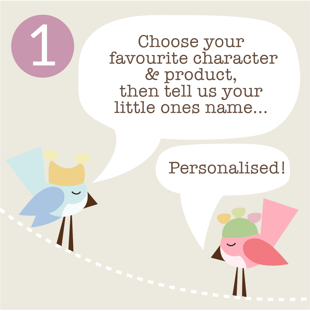 Select one of our products & your favourite character. Tell us your little one's name by Let us know the name by filling in the 'Your Name' section on the product page. If you would like to give a gift or have any further delivery instructions, please let us know in the space provided. Check all details carefully & then place your item in the cart.
