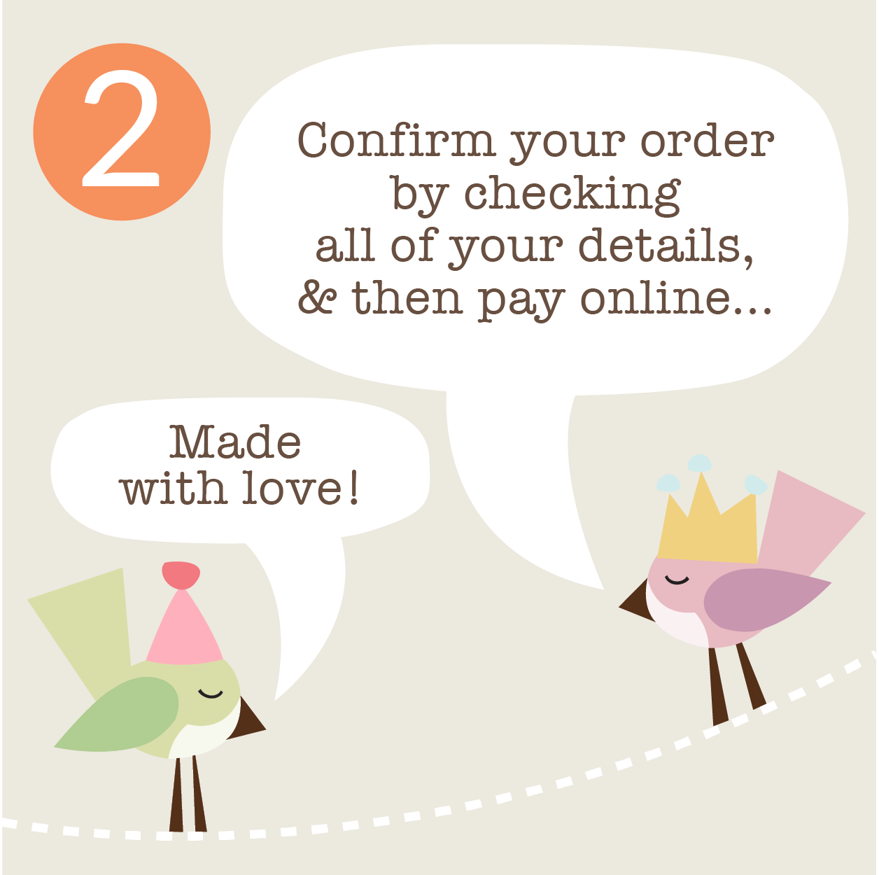 Confirm your product & personalisation details are correct. Then complete your contact & delivery details, making sure your address is perfect, complete your transaction & then sit back, relax & have a cup of tea!